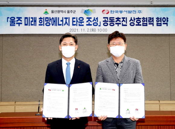 동서발전은 2일 울주군청에서 ‘울주 미래 희망에너지 타운 조성’ 공동추진 상호협력 협약을 체결했다. 이날 행사에는 김영문 동서발전 사장과 이선호 울주군수, 이유석 울주군 경제산업국장 등이 참석했다.