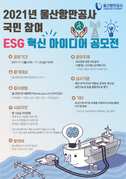 경영혁신을 위해 준비된 이번 공모전은 울산항만공사에 관심 있는 누구나 참여할 수 있으며, 최근 기업경영 트렌드로 주목받고 있는 ESG경영 각 분야(환경·사회·지배구조)에 대한 국민들의 참신한 아이디어를 기대하고 있다.