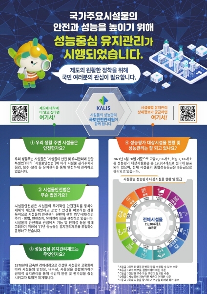 국토안전관리원은 ‘시설물의 안전 및 유지관리에 관한 특별법’이 전부개정(2018.1.18. 시행)되면서 도입된 성능중심 유지관리체계에 대한 인식 및 만족도 향상을 위해 연말까지 대국민 홍보를 실시한다.