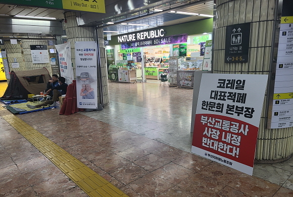 2일 오후 부산도시철도 1호선 부산시청역 내에 부산지하철 노조원들이 천막을 치고 부산교통공사 사장 내정 반대 시위를 하고 있는 모습 (사진=변옥환 기자)