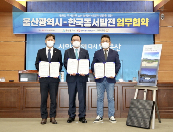 동서발전은 2일 울산시청에서 김영문 동서발전 사장과 송철호 울산시장, 이선봉 녹지정원국장 등이 참석한 가운데 ‘노면 블록형 태양광’ 연구개발 상호협력 협약을 체결했다.
