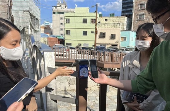 ‘부산 바다 SOS LAB 사업’의 일환으로 동구 초량동 이바구길에서 ‘전자스탬프 랠리 플랫폼’을 실증하고 있는 모습 (사진=부산정보산업진흥원 제공)