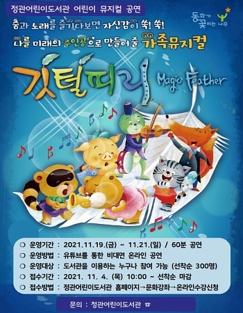 부산 기장군은 산하 정관어린이도서관이 오는 19일부터 21일까지 3일간 어린이를 위한 창작 뮤지컬 ‘깃털피리’를 온라인으로 공연을 선보인다고 3일 밝혔다.