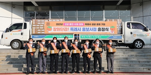 창원시는 2일 시청 정문 앞에서 '창원단감 특례시 홍보사절 출정식'을 갖고, 단감 4t을 경기권 3개 도시로 실어보냈다. 허성무 시장과 창원단감축제위원(위원장 이상득, 김택곤) 등이 참석했다.