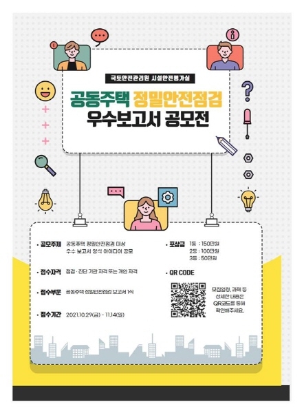 공모전은 안전진단기관 자격 또는 개인 자격으로 참여할 수 있으며, 점검보고서를 ‘아이디어로 플랫폼’을 통해 접수하면 된다. 심사를 거쳐 12월 초 선정될 우수보고서에는 50~150만원의 상금이 수여될 예정이다.