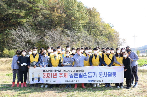 한국남동발전은 지난 3일 가을 수확철을 맞아 KOEN 나눔봉사단 20여 명이 참석한 가운데 진주시 수곡면 남강농원과 사랑그림숲(장애인직업재활시설)을 찾아 농촌 일손돕기 봉사활동을 펼쳤다.