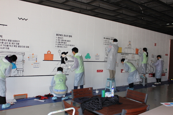 공단과 안전체험교육원 직원들은 경남학생안전체험교육원 다목적 휴게공간인 ‘안전마루’ 벽면에 ▲승강기 안전수칙 ▲화재 및 지진 발생 시 행동요령 등 승강기를 비롯한 생활안전 수칙을 벽화로 그려, 학생안전체험교육원을 찾는 방문객들의 안전의식 향상에 기여할 수 있도록 했다.