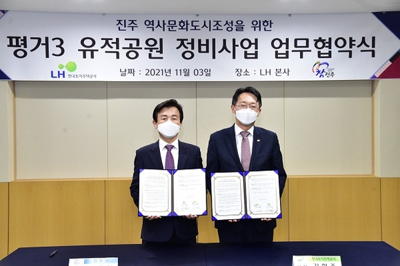 경남 진주시는 3일 LH 본사에서 '진주평거3택지 개발사업지구 내 유적 보수사업 협약'을 체결했다.