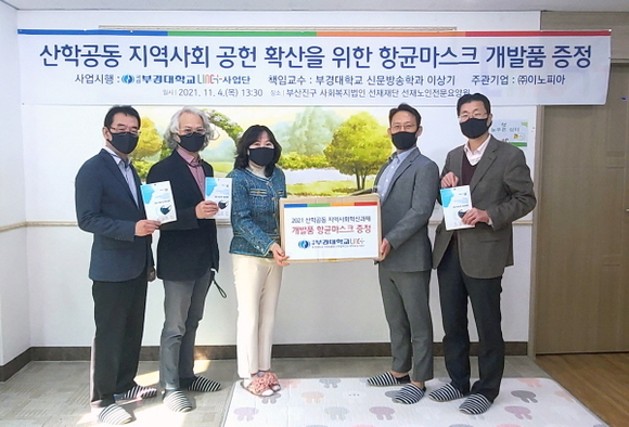 기부한 항균 마스크는 기능성 마스크 제조 스타트업인 ㈜이노피아가 부경대 링크플러스사업단의 ‘산학공동 지역사회혁신과제(책임교수 이상기)’에 참여해 개발한 것이다. 과제 목표는 기업의 이윤 창출은 물론 지역사회에도 공헌할 수 있도록 인체 유해물질 배출이 없는 기능성 항균 마스크 제품을 개발하는 것이다.