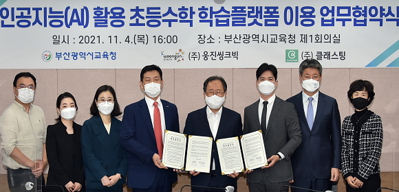 부산시교육청이 지난 4일 오후 본청 제1회의실에서 웅진씽크빅과 클래스팅과 ‘인공지능(AI) 초등수학 학습 플랫폼 이용 협약’을 체결했다고 5일 밝혔다.