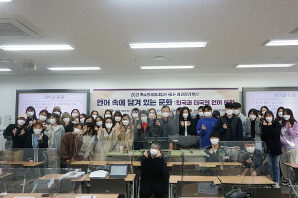 이날 특강에는 한국외국어대학교 태국어 통번역학과 정환승 교수가 방문, ‘언어 속에 담겨 있는 문화-한국과 태국의 언어문화 비교’를 주제로 대면 강연을 진행했다. 태국어과 재학생과 태국 유학생 등 총 40명이 참가해 기후적·지리적·종교적 요인에 따른 한국과 태국의 언어문화 배경을 이해하는 시간을 가졌다.