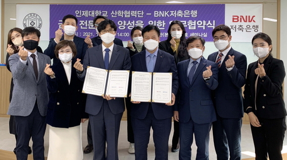 인제대학교 산학협력단과 BNK저축은행이 지난 4일 인당관 7층 세미나실에서 지역산업의 발전과 금융 전문인력 양성을 위한 업무협약을 체결했다.