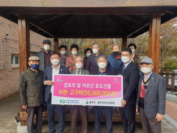 울주군 범서읍 범서경로당에서 열린 전달식에는 이선호 울주군수, 이상민 새울본부장과 행사를 주관한 이진호 울주군청년연합회 회장 등이 참석했다. 이날 전달한 고구마 440박스, 라면 1390박스 등 5000만원 상당의 효도선물로 지역 어르신들의 생활에 도움이 될 것으로 기대된다.