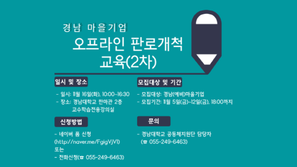 경남대학교 공동체지원단이 오는 16일 대학 한마관 2층 교수학습전용강의실에서 ‘오프라인 판로개척 2차 교육’을 개최한다고 5일 밝혔다.