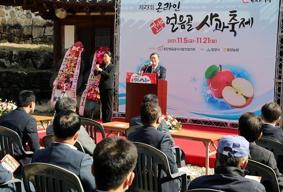올해 제23회 밀양 온라인 얼음골 사과축제가 산내면 동의각에서 축제얼음골사과발전협의회, 밀양농협, 밀양시의회, 밀양시관계자, 마을주민이 참석 가운데 지난 5일 개막했다.