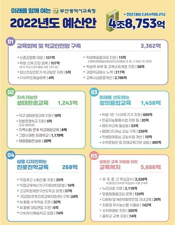 부산시교육청이 올해 예산보다 2854억원(6.2%) 증액한 총 4조 8753억원 규모의 ‘2022 부산시 교육비특별회계 예산안’을 시의회에 제출했다고 8일 발표했다.