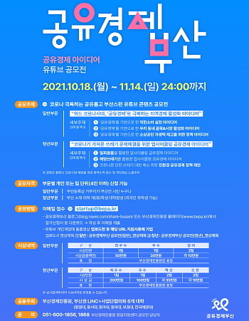 먼저 시민 부문은 주민등록상 거주지가 부산인 시민이면 누구나 참여할 수 있다. 작품은 ‘위드 코로나 시대, 공유경제로 극복하는 지역경제 활성화’를 주제로 ▲공유경제 기반 착한소비 실천 ▲공유경제 기반 우리동네 골목, 시장 활성화 ▲공유경제 기반 소상공인 자생력 제고를 위한 정책 아이디어 가운데 하나를 선택해 영상을 제작하면 된다.