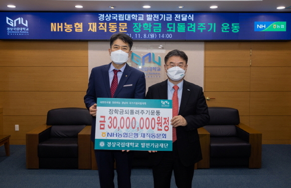 경상국립대학교(GNU)는 지난 8일 오후 2시 가좌캠퍼스 대학본부 접견실에서 ‘NH농협은행 재직 동문회 발전기금 전달식’을 개최했다. 농협은행 재직 동문회는 이날 발전기금 전달식에서 3000만원을 출연해 동문회가 7년 전의 약속을 지키게 됐다.