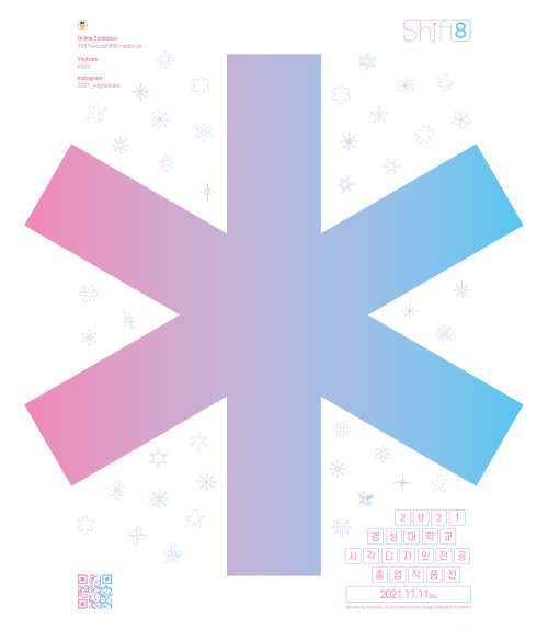 이번 전시회는 ‘Shift 8=*’를 주제로 디자인 작업 시 shift 키와 숫자 8키를 함께 눌러야만 *(별표)가 만들어진다는 것이 핵심 메시지다. 키보드의 키 하나로는 별표가 입력될 수 없다는 의미로 다양한 성격과 성향을 지닌 41명의 학생이 협력해 전시회를 준비했으며, 각각의 색과 모양을 가진 학생들이 함께 조화를 이뤄 빛나는 별표를 만들었음을 이번 전시를 통해 전달하고자 한다.