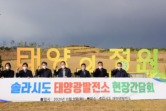 이승우 한국남부발전 사장(우측 세 번째)을 비롯한 남부발전 경영진이 국내 최대 태양광 ESS 연계 발전단지 ‘솔라시도 태양광발전소’를 찾아 현장 점검을 한 뒤 기념촬영하고 있다.