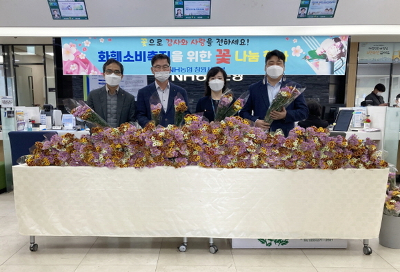 농협 창원시지부는 10일 최근 코로나19로 어려움이 가중된 화훼농가를 응원하기 위해 객장 방문 고객을 대상으로 ‘꽃 나눔 행사’를 실시했다. 행사는 꽃 소비 문화의 촉진과 화훼산업의 발전과 활성화를 위해 지역 대표행사인 ‘제21회 마산국화축제’와 맞춰 진행됐다.