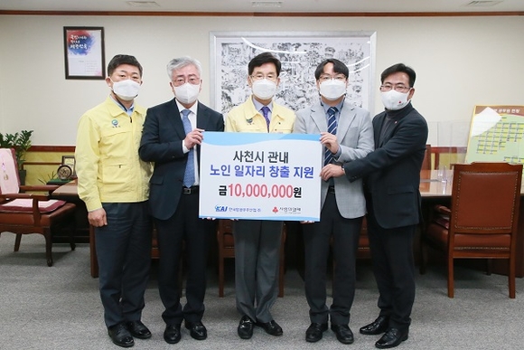 한국항공우주산업(KIA)이 지난 9일 사천시청을 방문해 노인일자리 창출을 위해 써 달라며 송도근 시장에게 1000만원의 기탁금을 전달했다.