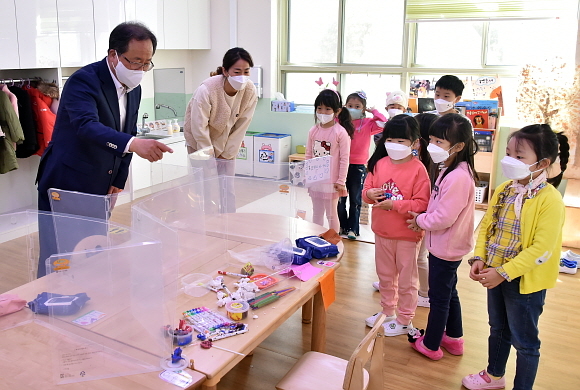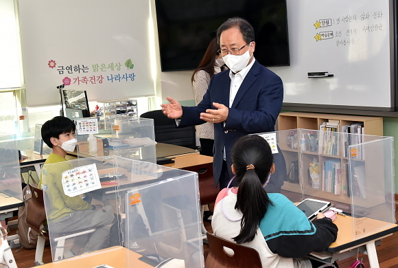 ‘단계적 일상 회복’이 시행 중인 가운데 지난 10일 김석준 부산시교육감(중앙)이 사하구 소재 당리초등학교 등을 방문해 ‘교내 일상 회복’ 준비상황 등을 점검하며 학생들을 격려하고 있다. 부산시교육청에 따르면 이날 김석준 시교육감은 당리초등학교를 비롯해 사동초등학교, 부일전자디자인고등학교, 경성전자고등학교를 잇따라 방문해 방역 상황 등을 점검했다. (사진=부산시교육청 제공)
