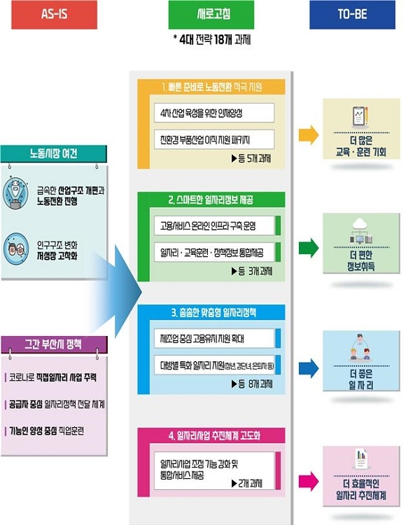 먼저 노동전환 대응 방안으로 디지털 전문가 1여만명을 양성하고 디지털 인재 유치를 위한 기업 인센티브 제도를 마련해 ‘인재양성~기업유치~일자리 창출’의 선순환 구조를 구축할 계획이다. 또 산업구조 전환에 따라 직업능력개발훈련사업을 기존 기능인 양성 위주의 과정에서 탈피해 ‘스마트 제조’ 등 4차 산업 분야 과정을 추가 연계해 실제 취업으로 연계한다는 계획이다.