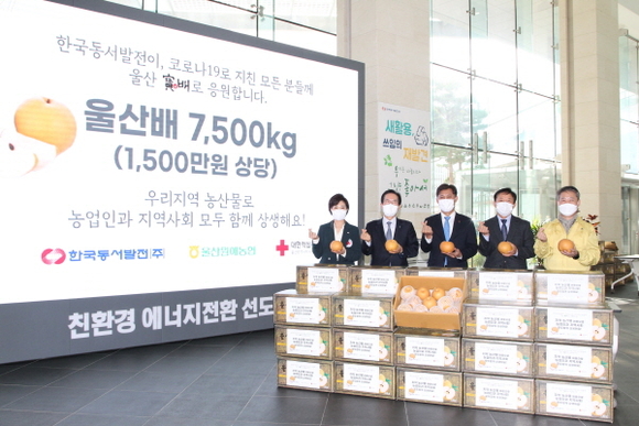 동서발전은 이날 울산 중구 소재 본사에서 ‘지역 농산물(울산 배) 전달식’을 가졌다. 전달식에는 김영문 동서발전 사장, 김광식 울산시 민생노동특보, 김철준 울산원예농협 조합장, 최병옥 울산원예농협 수출협의회장, 임영옥 대한적십자 울산지사 사무처장 등 관계자들이 참석했다.