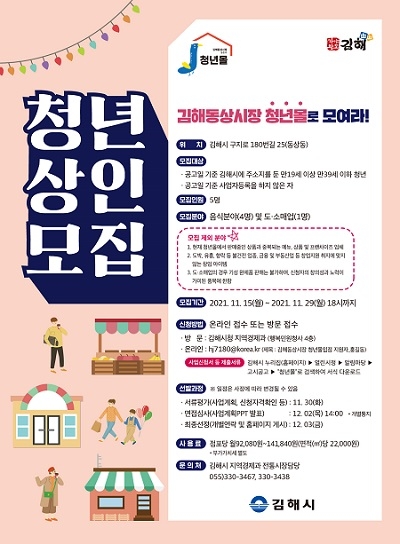 서류평가와 심층면접을 거쳐 최종 선발하며 입점을 희망하는 예비 청년상인은 김해시 누리에서 신청서와 첨부서류를 내려 받아 오는 29일까지 시청 지역경제과 전통시장팀을 방문하거나 이메일로 접수하면 된다.