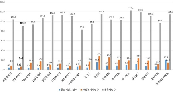 그러나 부산시의 생활 SOC 시설 수는 전국 하위권인 것으로 조사됐다. 문화기반시설, 사회복지시설, 체육시설 수는 인구 10만명당 전국 17개 시·도 가운데 최하위권이며 노인여가복지시설과 유아 1000명당 보육시설 수는 하위권을 기록했다.