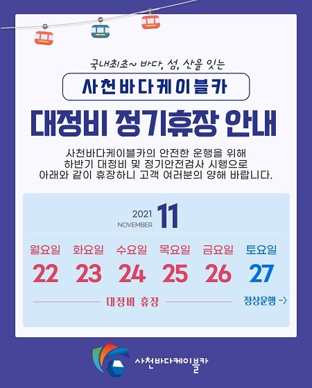 사천시시설관리공단은 사천바다케이블카 하반기 대정비와 정기 안전점검을 위해 오는 22일부터 26일까지 휴장을 실시한다고 15일 밝혔다.