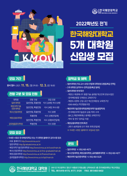 한국해양대학교 대학원은 2022학년도 전기 5개 대학원(일반대학원, 해양과학기술전문대학원, 해사산업대학원, 해양금융대학원, 글로벌물류대학원) 신입생을 모집한다고 밝혔다.