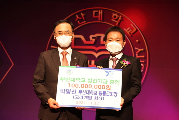 박명진 부산대 총동문회장은 대학 발전기금 1억원 출연 약정식을 갖고 “지역 거점대학인 부산대가 글로벌 대학으로 거듭나야 부울경이 대한민국 또 하나의 수도권이자 동아시아 허브로서의 경쟁력을 갖출 수 있을 것”이라고 밝혔다. 이후 행사 중 4억원의 추가 출연 의사를 발표하며 기존 부산대와 총동문회에 5억원을 출연한 것과 합쳐 총 10억원을 기부하겠다고 약속했다.