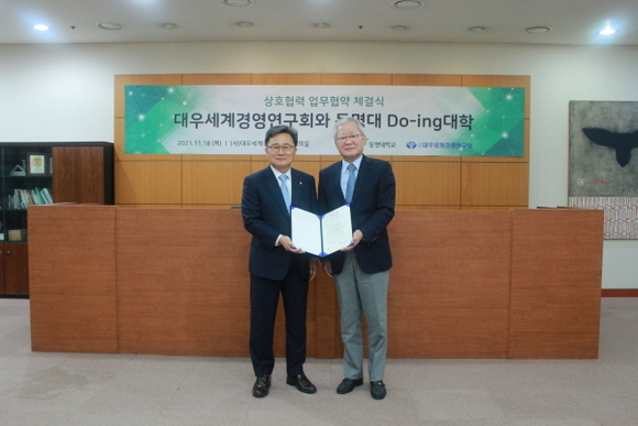 대우세계경영연구회는 3無(무학년·무학점·무티칭)혁신교육을 핵심으로 하는 동명대 두잉(Do-ing)대학의 신입생 모집과 교육에도 협력하기로 했다. 두잉대학의 실행 및 역량 중심 교육이 ‘김우중사관학교’가 지향하는 교육철학과 맞닿아 있다는 판단이다.