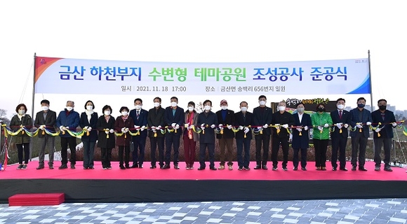 경남 진주시는 지난 18일 금산면 송백리 일원에서 조규일 시장과 도·시의원, 지역 사회단체장, 마을주민 등 50여 명이 참석한 가운데 '금산 송백 수변형 테마공원 준공식'을 가졌다.