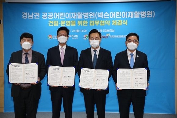 창원시는 22일 오후 2시 경남도청 도정회의실에서 경남권 최초 공공어린이재활병원 건립사업의 성공적인 추진을 위해 도, 넥슨재단, 창원경상국립대학교병원과 업무협약을 체결했다.