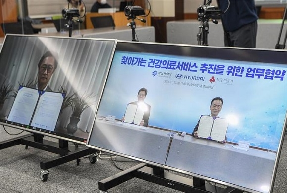 부산시가 부산사회복지공동모금회, 현대자동차와 지난 22일 오후 ‘찾아가는 건강의료서비스 추진 위한 업무협약’을 온·오프라인 방식으로 체결했다고 23일 밝혔다. 현대차그룹 사장은 화상으로 참여했다.