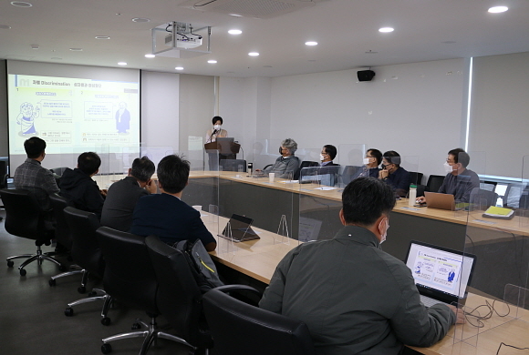 지난 22일 부산테크노파크 본사에서 ‘임직원 성 평등 교육’이 진행된 가운데 변정희 여성인권지원센터 상임대표(맨 앞)가 초청돼 강연을 하고 있다. 부산테크노파크에 따르면 이날 변정희 상임대표는 ‘성 평등, 사적 영역 속의 공적 의제’를 주제로, 온·오프라인 병행 방식으로 임직원 성 평등 교육을 진행했다. (사진=부산테크노파크 제공)