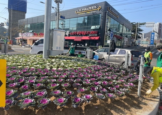행사에는 일광면 새마을부녀회와 환경정비 기간제 근무자, 공무원 등 30여명이 참여해 주민 보행과 관광객 방문이 잦은 일광역 회전교차로 교통섬 등에 ‘꽃양배추’ 1500본을 식재했다.