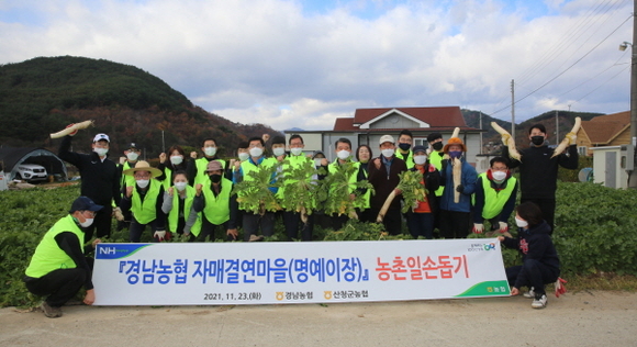 이날 일손돕기에는 경남농협 윤해진 본부장, 농혐산청군지부 한동석 지부장, 산청군농협 박충기 조합장 등 농협봉사단 25여 명이 참여했다. 이들은 단무지 무 수확을 돕고 마을 경로당을 찾아 마스크 등 150만원 상당의 격려품을 전달했다.
