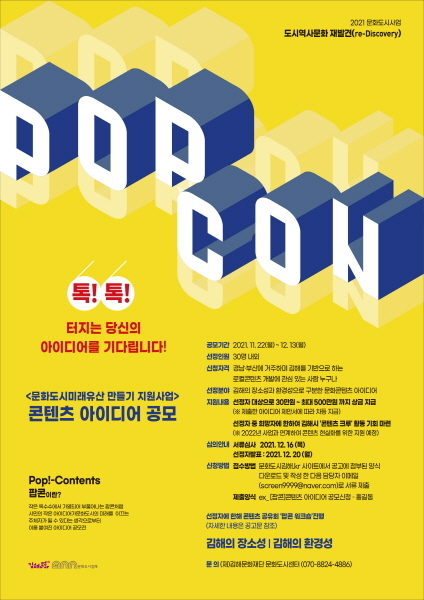 김해문화재단 김해문화도시센터는 ‘문화도시 미래유산 만들기’ 콘텐츠 아이디어 공모 ‘Pop!-Contents’(이하 팝콘)를 이달 22일부터 12월 13일까지 진행한다.