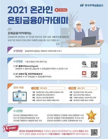 앞서 주금공은 지난 2015년부터 ‘은퇴금융 아카데미’를 매년 개설해 왔으며 지난해에는 코로나19 사태 발발로 인해 온라인 금융교육 방식으로 전환 개최한 바 있다. 올해도 코로나19 확산 방지 차원에서 전면 온라인 강의로 진행된다.