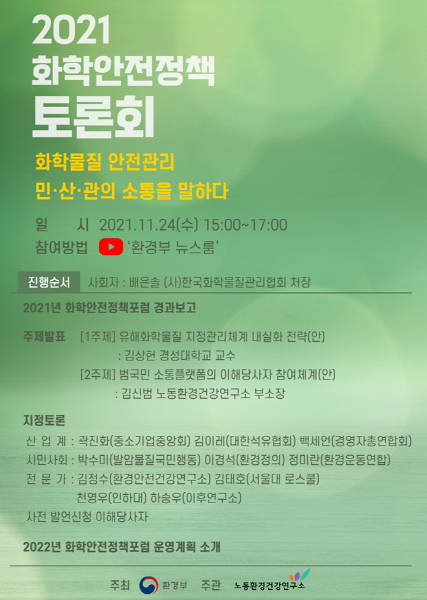 김 교수는 환경부가 올해 6월부터 5차례에 걸쳐 진행한 화학안전정책포럼내의 공개토론회에서 논의된 내용을 토대로 이번 토론회에서 발제한다. 내용은 ▲유해화학물질 지정체계 내실화의 필요성 ▲화학물질로부터 안전한 사회 구축을 위한 방향성 ▲이를 위한 제안과 향후 계획 등이다.