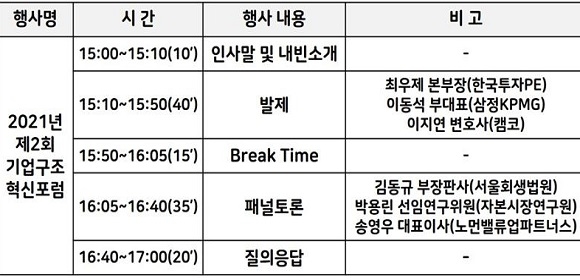 포럼에는 국민대 이동엽 교수의 사회로 먼저 한국투자PE 최우제 본부장이 ‘사모펀드 통한 사전적 구조조정 현황과 의미’를 주제로 발제한다. 이어 삼정KPMG 이동석 부대표가 ‘사전적 구조조정 시장에서 ESG 의의와 활용’을 주제로 발제한다.