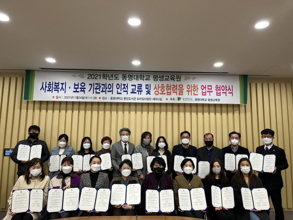 동명대학교 평생교육원은 24일 중앙도서관 2층 PRIME사업단 세미나실에서 총 17개 사회복지기관 및 보육기관과의 인적 교류 및 상호협력 활성화 관련 협약식을 가졌다.