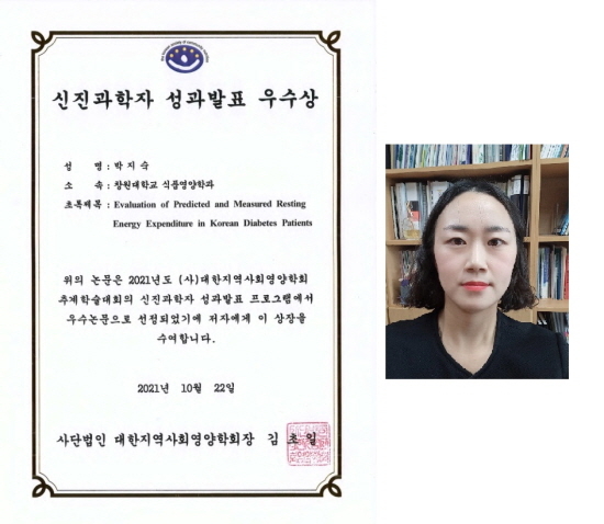 창원대학교는 식품영양학과 박지숙 박사후연구원(인체영양실험실, 지도교수 임정은)이 서울대학교 글로벌공학교육센터에서 온라인으로 개최된 ‘2021 대한지역사회영양학회 추계학술대회’에서 신진과학자 성과발표 부문 우수상을 수상했다.