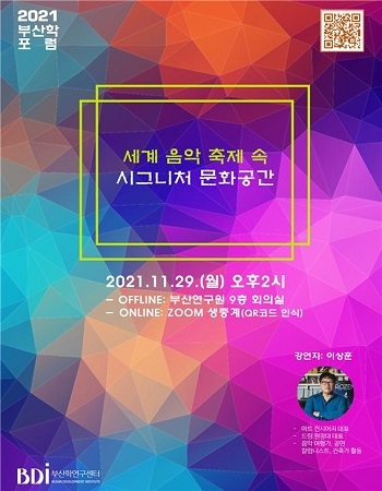 부산연구원은 산하 부산학연구센터가 오는 29일 오후 2시 본원 9층 회의실에서 ‘세계 음악축제 속 시그니처 문화 공간’을 주제로 부산학 포럼을 연다고 26일 밝혔다.