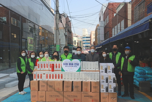 부산항만공사(BPA)가 지난 25일 본사 인근에 위치한 수정전통시장을 찾아 상인회에 마스크 1000개와 소화기 140개를 전달한 가운데 양측 관계자들이 함께 기념촬영하고 있다. BPA에 따르면 이날 전통시장 지원 활동은 시장 소상공인의 ‘단계적 일상 회복 지원’과 ‘겨울철 화재 예방’을 위해 추진됐다. (사진=부산항만공사 제공)