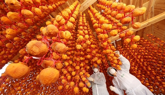 29일 경남 함양군 병곡면 곶감건조대에서 김철수 부부가 겨울햇살에 달콤하고 쫀득하게 잘 익어가는 곶감을 손질히고 있다. 지리산 함양곶감은 내달 9일 안의농협 서하지점 곶감경매장에서 초매식을 갖고 본격 출하된다. (사진=함양군 제공)